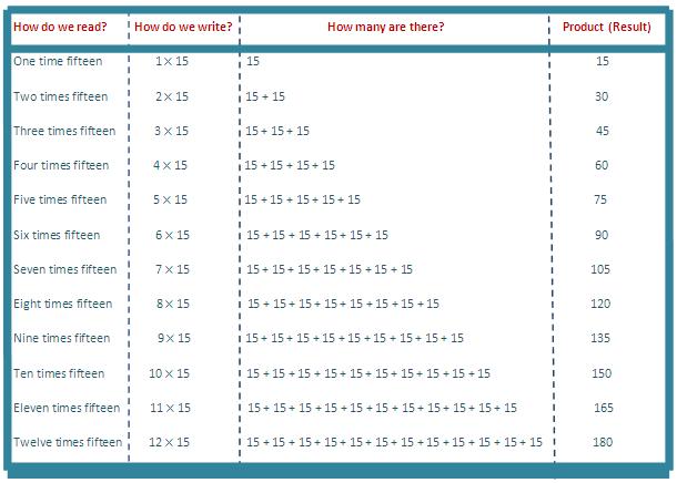 Let us follow the how to read and write multiplication of 15 times table chart: