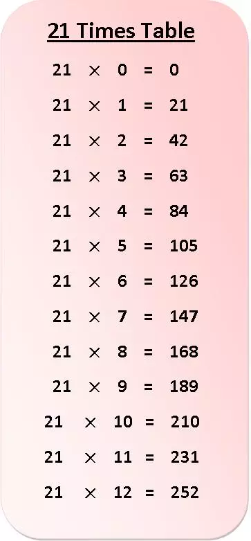 Print out the multiplication table of 21 and hang it on your wall which will help you to learn 21 times tables.