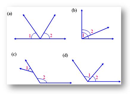 (d) ∠1 and ∠2 are adjacent because they have a common arm, a common vertex and interiors do not overlap.