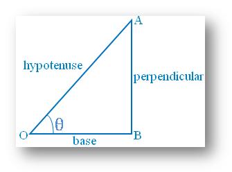 Let us consider the right-angled triangle ABO as shown in the adjacent figure. Now, with respect to the acute angle ∠AOB = θ, the adjacent side OA becomes the hypotenuse and the other (adjacent) side OB becomes the base. So, in this case AB becomes the perpendicular.