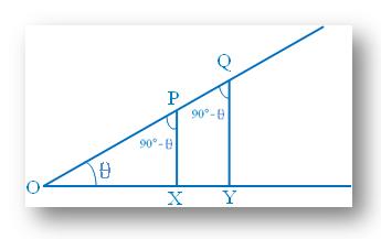 | While in this figure from two points R and S on OA perpendiculars RM and SN are dropped on OA1. Consider the right- angled triangles POX, QOY, ROM and SON. As one of the acute angles is θ, the other angle is 90° - θ°. So, all these right-angled triangles are equiangular, that is, similar. |