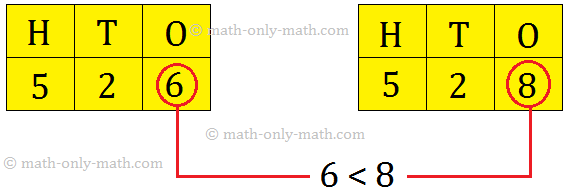 Here, the digits in the hundreds place and the tens place of the two numbers are the same. So, we compare the digits in the ones place.