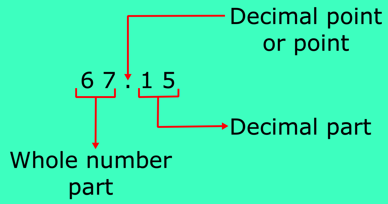 A fractional number whose denominator is 10 or multiple of 10 is called a decimal. Every decimal has two parts whole number part and decimal part. These two parts are separated by a dot or point. This dot or point is known as decimal point.