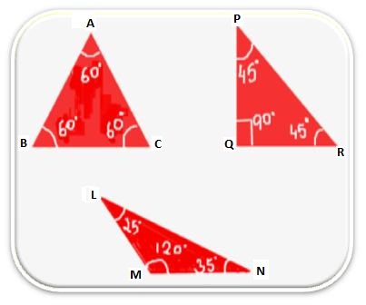 In ∆PQR ∠PQR + ∠QRP + ∠RPQ = 180° In ∆LMN ∠LMN + ∠MNL + ∠NLM = 180° |