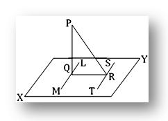Proof: Since LM is parallel to ST and QR perpendicular to ST hence, QR is perpendicular to LM. Again, PQ is perpendicular to the plane XY; hence, it is perpendicular to the line LM. Therefore, LM is perpendicular to both PQ and QR at Q. This implies LM is perpendicular to the plane PQR. Now, ST and LM are parallel and LM is perpendicular to the plane PQR; hence, ST is perpendicular to the plane PQR. Therefore, ST is perpendicular to PR or in other words, PR is perpendicular to ST.